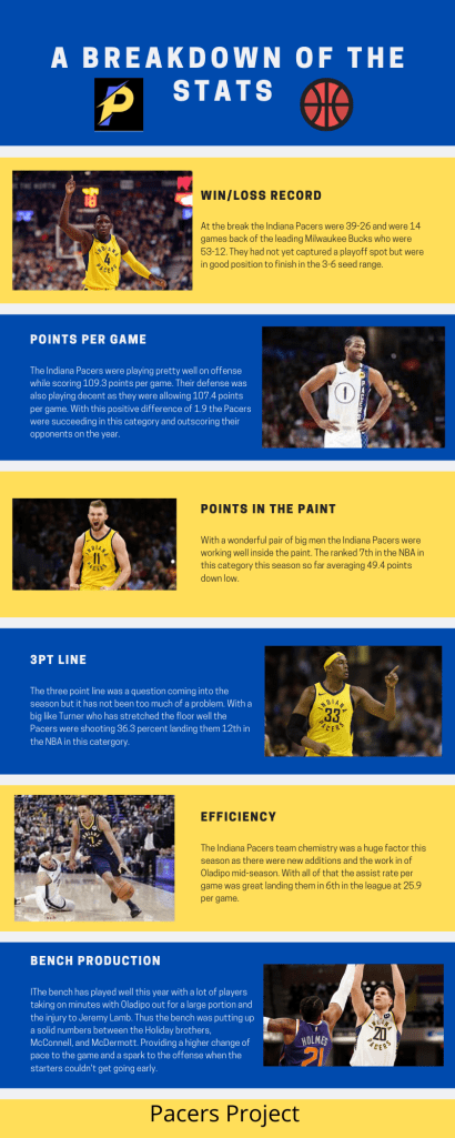 Other blogs such as the blog 1070 The Fan, which is the blog from a radio show as well, like to breakdown how the season is going thus far. Blogs will react to the record of the team, the standings, and the playoff picture to evaluate how the team is performing overall. In this article, https://www.1075thefan.com/blogs/kevins-corner/pacers-coverage/pacers-reach-season-midway-point-11-games-above-500, you can see the breakdown that the blog gave at the midway point of the season and how they felt as they felt the team was performing at that point.
